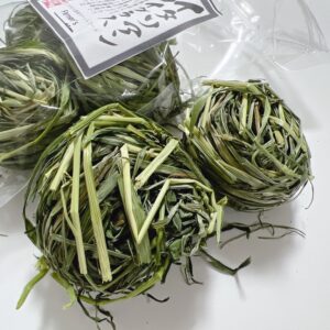 有機基準の倍近くの厳格農法で栽培され最低5年間化成肥料、除草剤、農薬等の薬剤を一切使わない畑で育てた牧草をつなぎを使わず丸めたうさぎさんに安心な食べれるおもちゃ